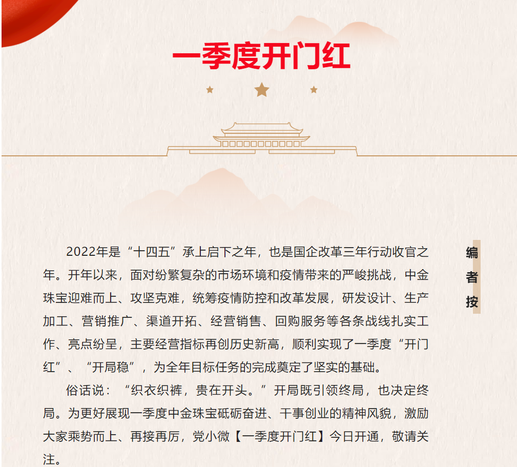 面對當前復雜多變的國內外經濟形勢以及疫情常態化下的黃金消費市場持續低迷等不利局面,中金珠寶在產品端如何“破題”?答案顯而易見:堅持“文化+”賦能產品研發,賦能企業發展,一方面在做好傳統渠道業務拓展的同時完善產業鏈,全面樹立“黃金為民,送福萬家”的央企形象;另一方面,在傳遞黃金價值的同時深度思考核心業務,做優做強產品,讓文化產品“飛入尋常百姓家”,不斷滿足人民群眾對美好生活的需要。相信在奠定了一季度開門紅良好開局的基礎上,中金珠寶產品設計研發團隊將繼續瞄準全年任務目標,在項目開發中堅定文化自信,在團隊歷練中凝聚奮進力量,以優異成績迎接黨的二十大勝利召開!