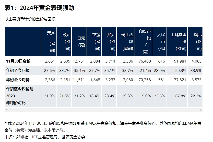 今年迄今為止,以美元計價的金價漲幅超過28%,年平均交易價格較2023年高出22%;其他貨幣金價表現同樣強勁(表1)。今年黃金已40次打破歷史記錄,三季度黃金需求總量首次超過了1,000億美元。