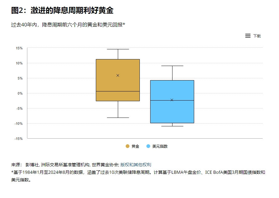 歷史數據表明,在降息周期開始的前六個月,金價平均漲幅為6%。而隨后黃金的表現則受到降息周期的持續時間和深度影響(圖2)。