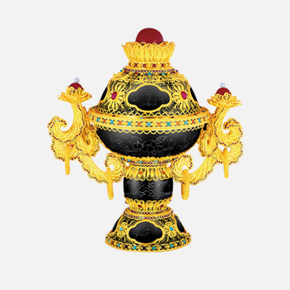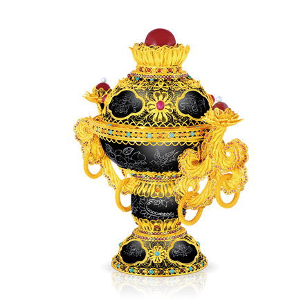 藏品以墨玉制成爐身,以金包銀花絲覆蓋其上,并以花絲堆壘成蓮花瓣圖案,爐身之上金包銀花絲留空處形成朵朵祥云圖案。祥云內以銀絲編成蝙蝠壽桃圖案表達“福壽之意”其中蝙蝠又懷抱銅錢,巧妙地運用諧音表達“福在眼前”的祝福。并鑲嵌有佛教七寶之一的瑪瑙等寶石,既可作為擺件祈福納祥,又可作為高端貴金屬藝術品進行投資、鑒賞與收藏。